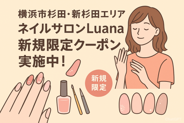 横浜市磯子区の杉田・新杉田エリアでネイルサロンをお探しの皆さまへ。ネイルサロンLuanaでは、ただいま【新規のお客様限定クーポン】を実施しております。初めてネイルを体験される方や、これから行きつけのサロンを探している方にぴったりのお得なクーポンです。