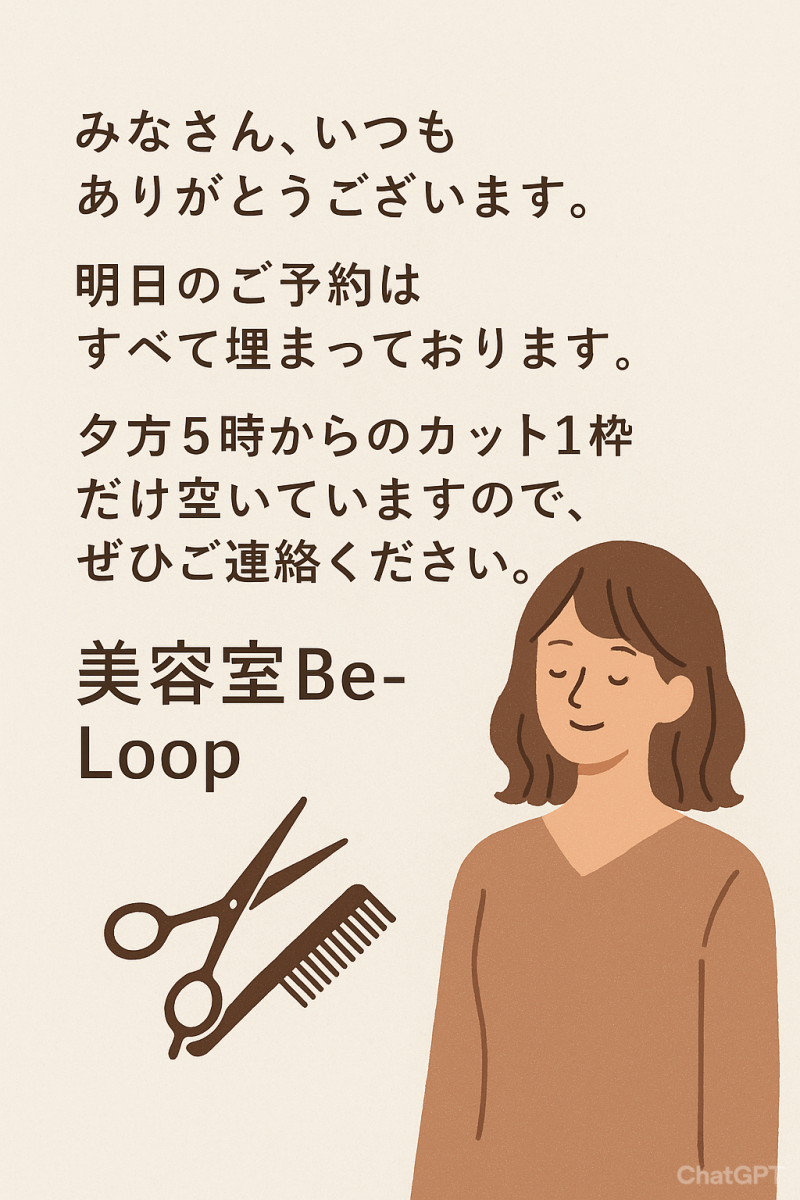 Be-Loopを大切に思ってくださるお客様のおかげで、明日のご予約はすでにほとんど埋まっております。